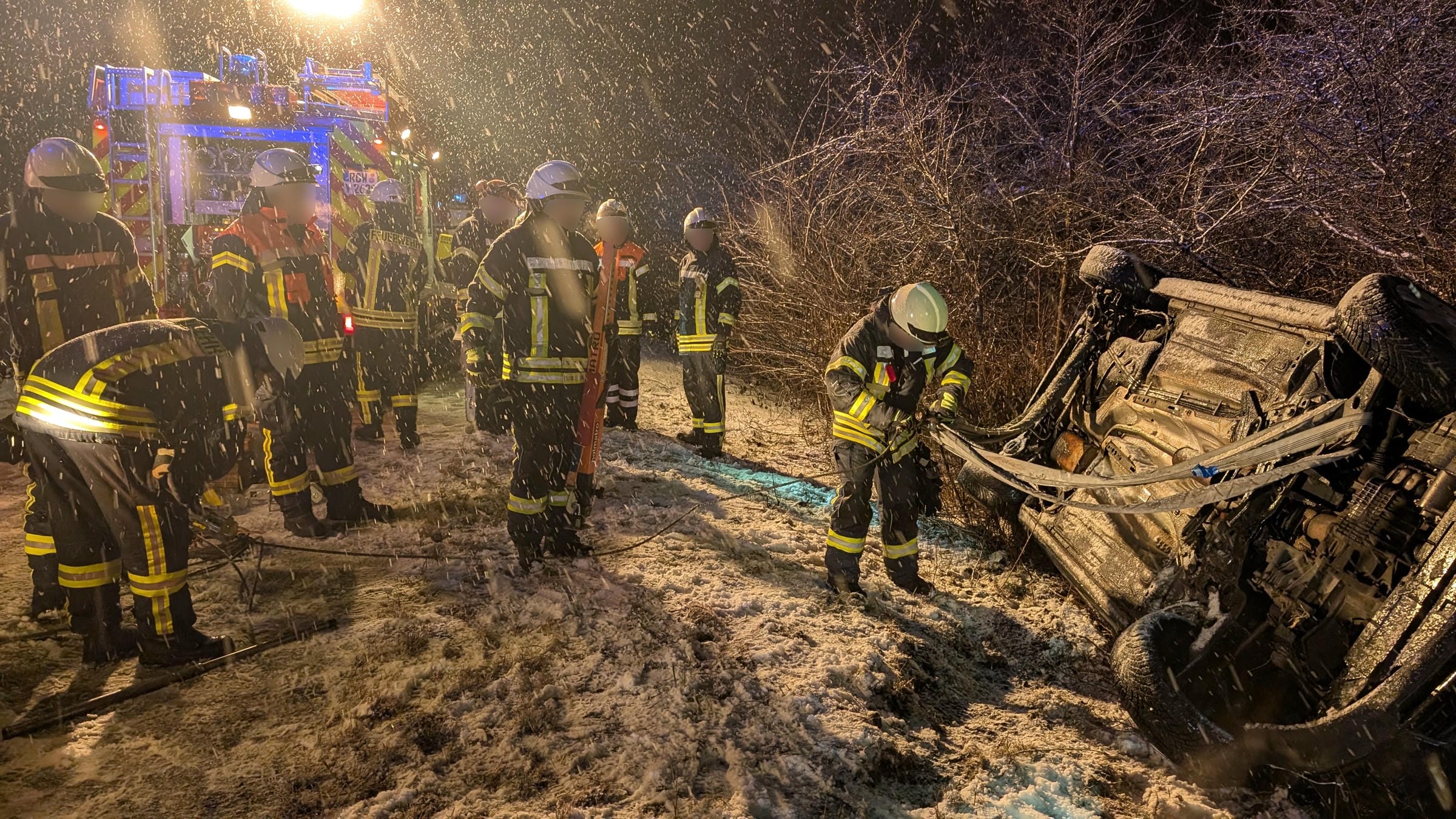 In dem Fahrzueg waren dadurch zwei Personen eingschlossen. Diese konnten nachdem das Fahrzeuge mit Hilfe eines Greifzuges stablisiert worden war, aus demselb erfolgreich befreit werden.