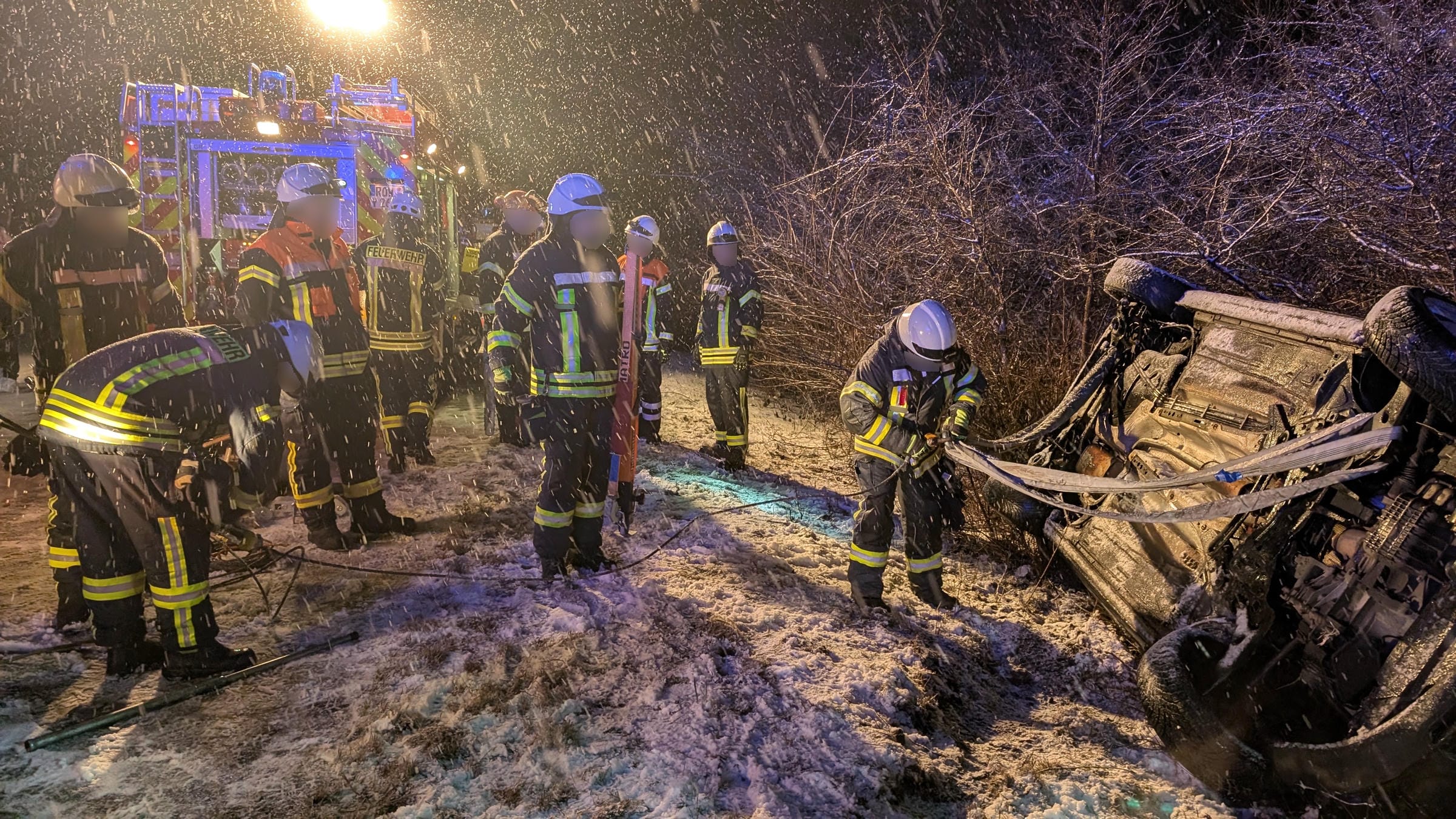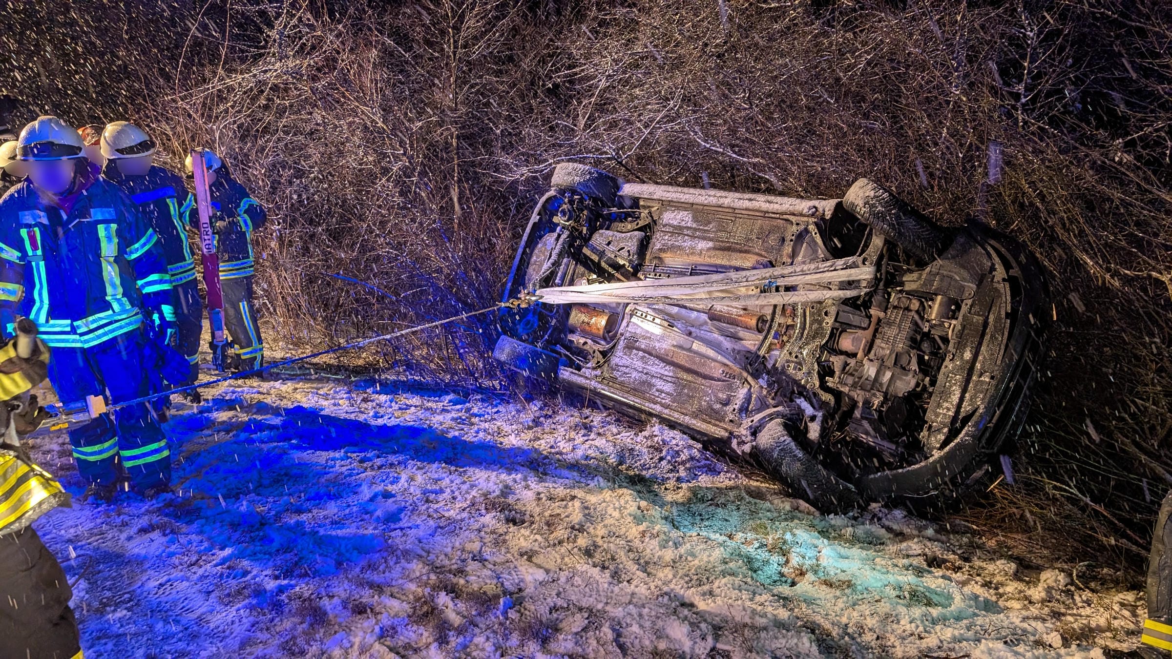 In dem Fahrzueg waren dadurch zwei Personen eingschlossen. Diese konnten nachdem das Fahrzeuge mit Hilfe eines Greifzuges stablisiert worden war, aus demselb erfolgreich befreit werden.