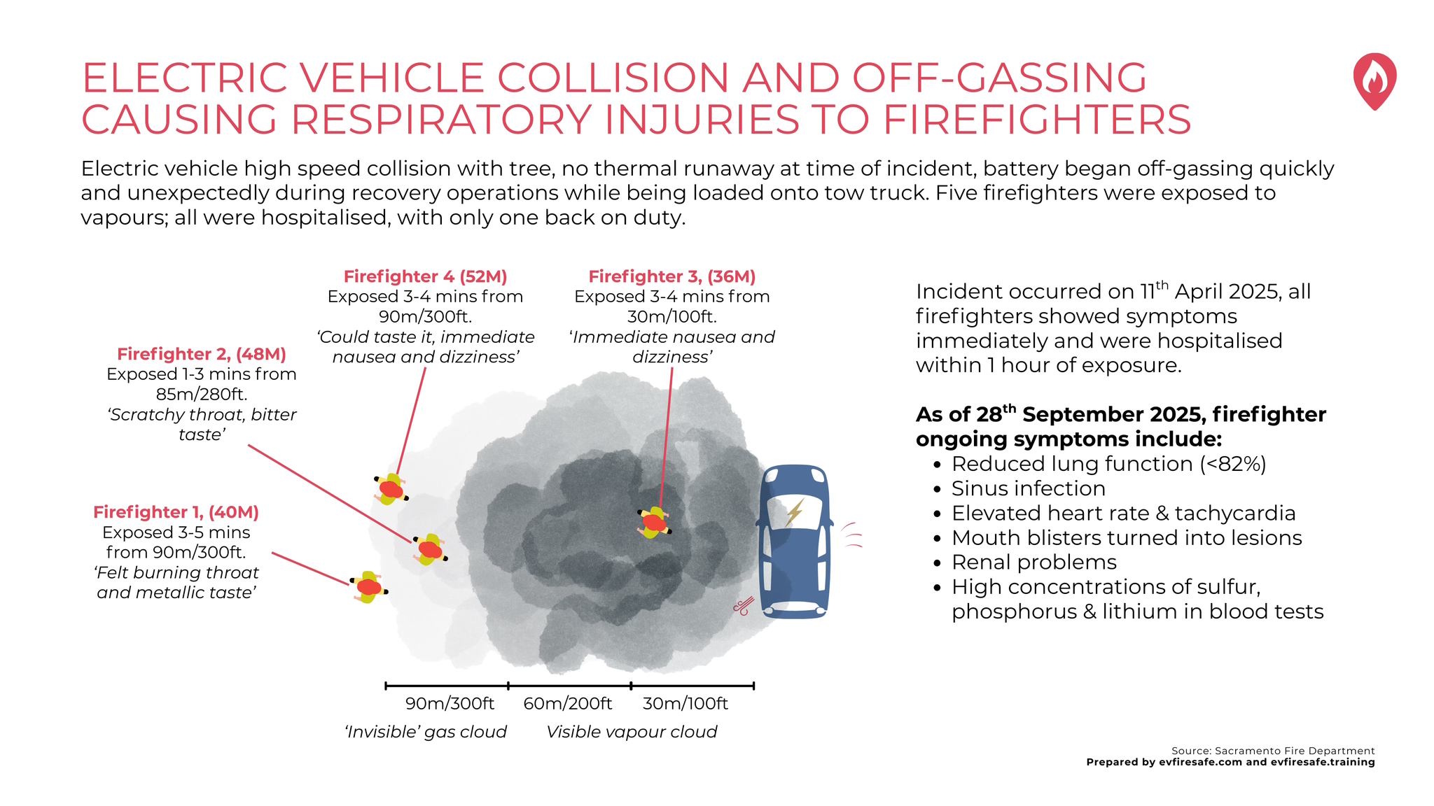 Am 11. April 2025 waren Feuerwehrleute der Feuerwehr Sacramento nach einem Verkehrsunfall im Einsatz. Ein Elektrofahrzeug war dabei mit einem Baum kollidiert. Die Einsatzkräfte befreiten Insassen des PKWs, der im Anschluss ins Krankenhaus eingeliefert wurde. Durch den Unfall wurden ca. 5 % der Lithium-Ionenzellen aus dem HV-Pack des PKW über die Straße verteilt. Von den Feuerwehrleuten wurde mit der entsprechenden PSA unter Atemschutz abgearbeitet.